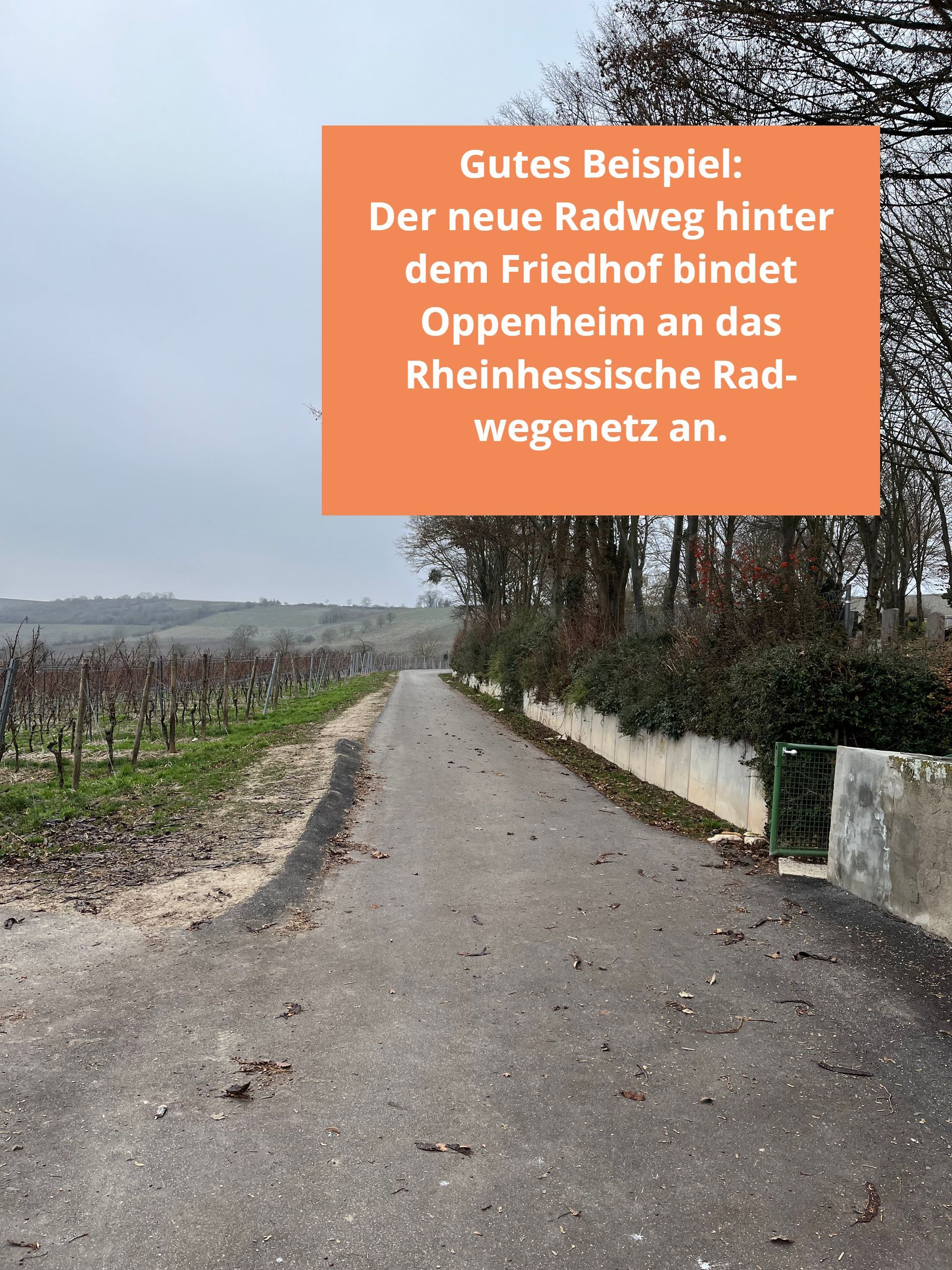 Die Oppenheimer Neustadt beherbergt im nördlichen Teil weiterführende Schulen und in Zukunft auch hoffentlich wieder ein funktionierendes und attraktives Hallenbad. Im Süden grenzen die beiden Gewerbegebiete an, die über zwei Kreisverkehre miteinander verbunden sind. Viele Bürgerinnen und Bürger, sowie Schülerinnen und Schüler nutzen das Fahrrad als preiswertes und umweltfreundliches Fortbewegungsmittel. Die Zahl der ausgewiesenen Radwege in diesem Gebiet ist jedoch sehr gering und beschränkt sich auf Teile der „Friedrich-Ebert-Straße“. Vor allem der „Minikreisel“ mit der Zuwegung zum Sant-Ambrogio-Ring ist ein ausgesprochenes Sicherheitsrisiko für Radfahrer und Fußgänger. Das Teilen des Bürgersteigs durch Fußgänger und Radfahrer ohne abgegrenzte Fahrspuren führt immer wieder zu Konflikten und begründet außerdem keine Benutzungspflicht des „Radweges“. Dadurch kann es regelmäßig dazu kommen, dass Radfahrer auf der Straße fahren.