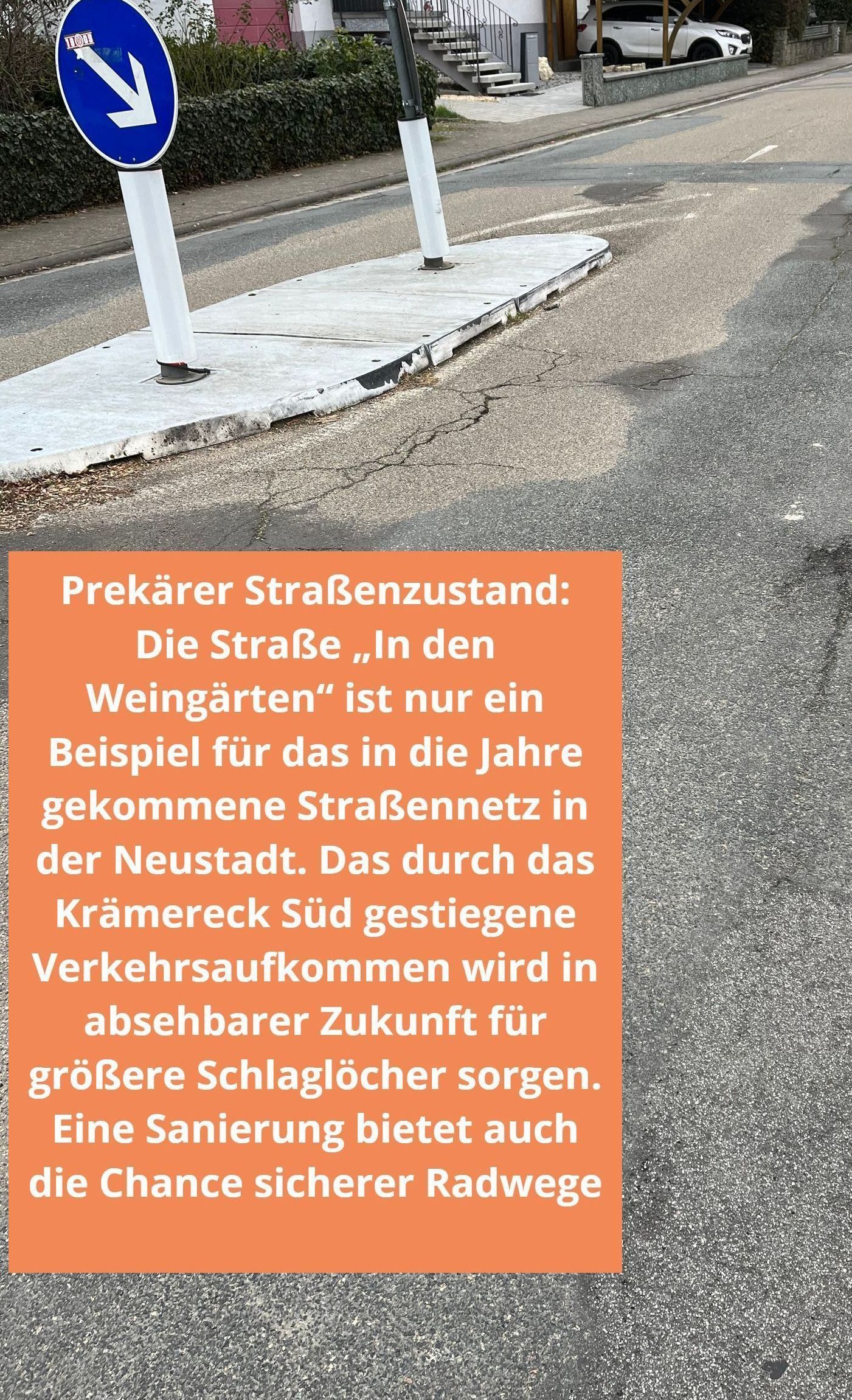 Der Verkehrsausschuss hat sich im Oktober 2023 dafür ausgesprochen, die Straße In den Weingärten zwischen Im Herrnweiher und Im Grohfuß sowie die Engelbertstraße priorisiert zu sanieren und damit eine Prioritätenliste erstellt. Die CDU begrüßt das ausdrücklich. In beiden Fällen muss die Chance genutzt werden, hier Verbesserungen für Fußgänger und Radfahrer zu schaffen und speziell In den Weingärten für mehr Verkehrsberuhigung zu sorgen.